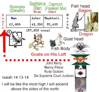 | Moving from the hand into the heart of the tabernacle we find G-d's enemies who seek to overthrow his kingdom through violence their arrogance and wickedness in taking it place them as goats on his left. His hand holds Naphtali born from Jacob and Bilhah a servant girl of Rachel who at this time could not conceive. His flag is a deer/ doe /gazelle fast runners his name means "my struggle." the last of two sons born to Bilhah and named by Rachel. The star sign of Capricorn is his a freakish mix of a goat's head with a body of a fish. Babylon honored Dagon their priests used the heads of fish as part of their pagan worship. Rome is the freakish mix but in the end many of them will be fast runners to bring in the harvest when they realize who they will be left behind with and the "get away from me I never knew you", applies to them. Next is Asher second son of Jacob and Zilpah Leah's handmaid, the name means happy his flag is a tree, his star sign is Sagittarius a horse and rider representing war. War is necessary to defend us from the wicked who seek to impose false gods among us. War brings death and G-d does not enjoy war However, as a protector HE must teach us to war. War is an invention of man in obedience to evil intent. The tree may symbolize the many wars and people that will come as a result of misplaced people. Last is Dan older son of Jacob and Bilhah his flag is the eagle, his star sign Scorpio an instrument of death and poison. The eagle has always been the symbol of war in the earth. In G-d's thrown room it is the face of one of the beasts with six wings crying holy, holy, holy. The enemy has defiled this creature, every wicked regime risen up to build Satan's one world order has always used an eagle as its mascot. America used it only to draw the dragon and his body of false priests into the trap. The meek shall inherit the earth not the violent and it is G-d's joy to give us the kingdom who give HIM their lives. Note: on the left hand are not pure Son's of Jacob's two wives the ones that he labored longest for they are in fact their handmaids. God has made some for the firs and some for eternal glory. |