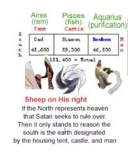 | The arms of Christ facing you, the right arm is the south which represents the earth. North, of course, would be the throne of G-d and the violent seek to take it by force. We will do north next. Moving towards the center or the heart of the tabernacle the mercy seat we are given Gad his flag reveals a tent (bodies to house spirit) Gad is Aries the Ram's horn Israel is established G-d's people HIS only priesthood to point to Christ. Gad is the son born to Zilpah Leah was her mistress. Next is Simeon his flag is castle the making of kings /rulers using Israel to determine who are the kings. His star sign is Pisces he stayed behind as collateral to draw Benjamin into Egypt G-d is a fisherman we are leaving Pisces ending the fishing season going into purification. Aquarius is Reuben, the end of mortal man the start of immortal man. Rueben was the one who persuaded the others not to kill Joseph. Man is suffering because he ignores the law thou shall not kill. Today death is profit as we send our children off to war. Those who profit the most are those who hold the most in the military industrial complex these are the goats on his left. |